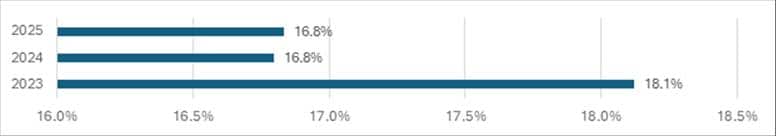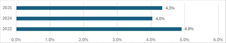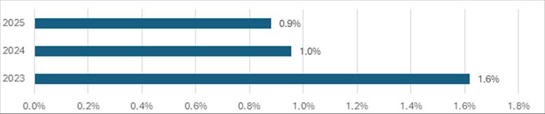 - There is a steady decline in candidates reporting connections to gang members on social media, dropping from 1.6% in 2023 to 0.9% in 2025. This downward trend indicates a gradual improvement in reducing external criminal associations.